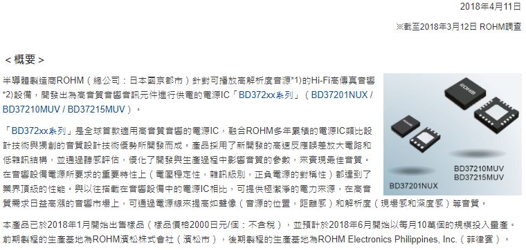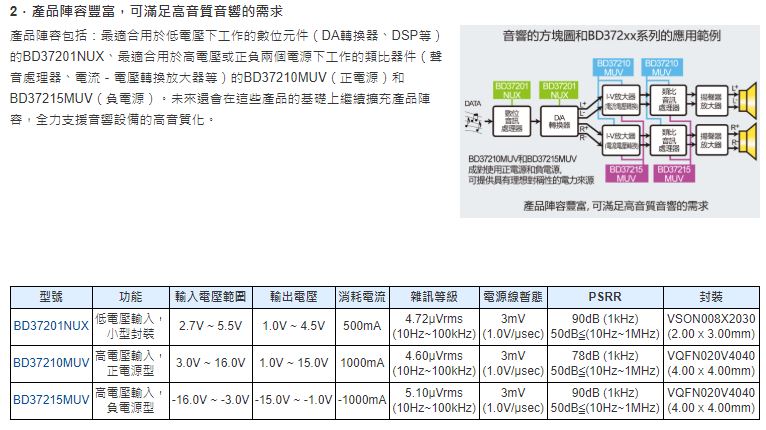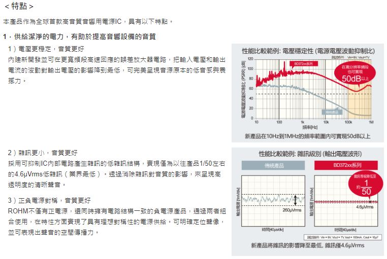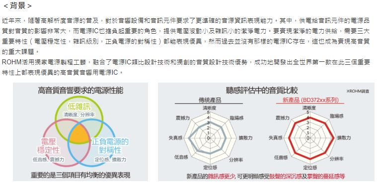 - ROHM 全球首創!※ ROHM開發出高音質音響專用電源IC「BD372xx系列」 融合類比設計與音質設計技術優勢 透過電源線提升音質
