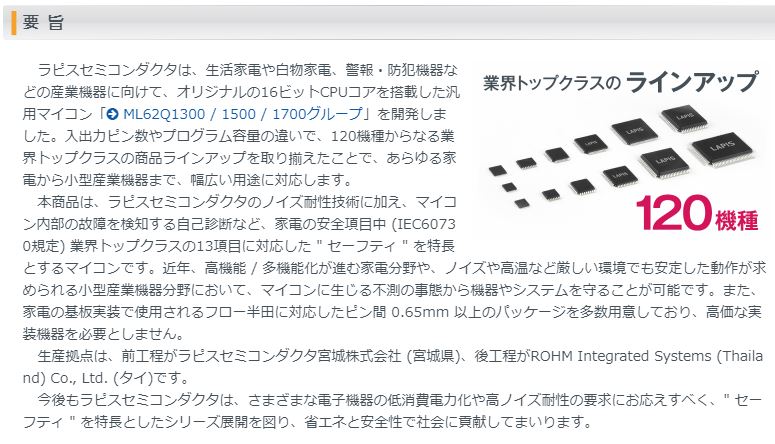 - ROHM 安全機能搭載16ビット汎用マイコン 「ML62Q1300/1500/1700グループ」、 家電・産業機器用途を網羅する業界トップクラスの 120機種をフルラインアップ