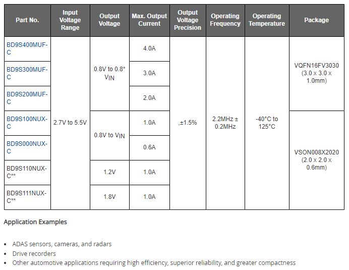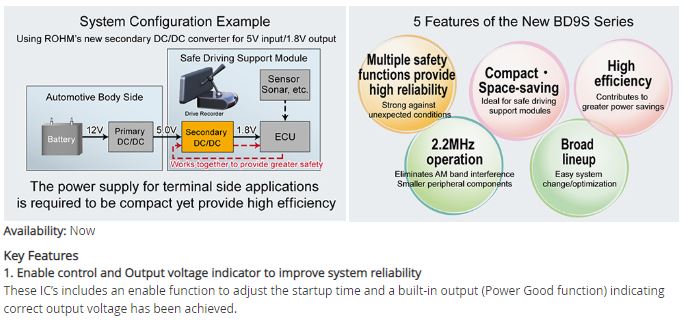 - ROHM推出可輸出監測功能之超小型車用降壓DC/DC轉換器「BD9S系列」 體積小具高效率及高可靠性 有效提昇感測器與攝影機等安全駕駛輔助模組的發展