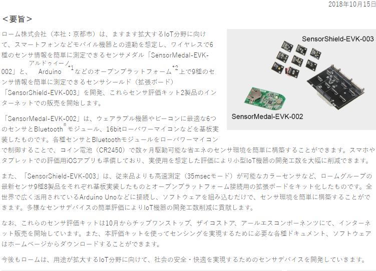 ROHM 最新IoT機器のプロトタイプ開発に最適、5分で測れるセンサ評価キット 「SensorセンサMedalメダル-EVK-002」「SensorセンサShieldシールド-EVK-003」を販売開始