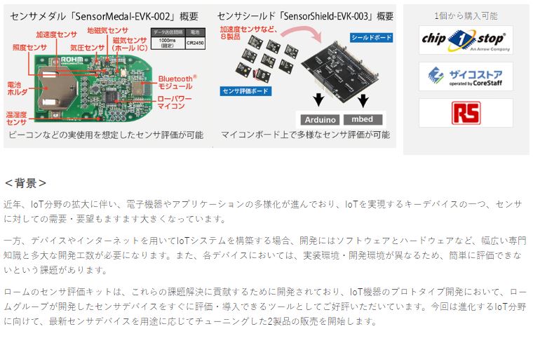 - ROHM 最新IoT機器のプロトタイプ開発に最適、5分で測れるセンサ評価キット 「SensorセンサMedalメダル-EVK-002」「SensorセンサShieldシールド-EVK-003」を販売開始