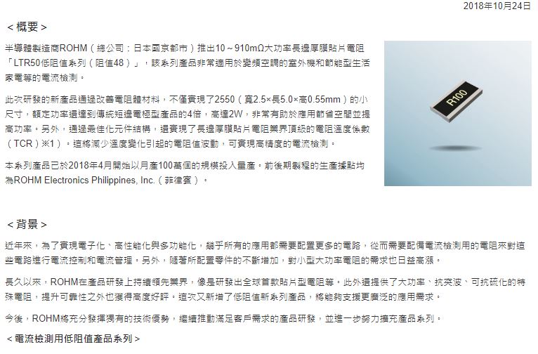 - ROHM研發出具業界頂級電阻溫度係數的2W大功率電阻「LTR50低阻值系列」 適用於生活家電的電流檢測,有助於提高應用的可靠性