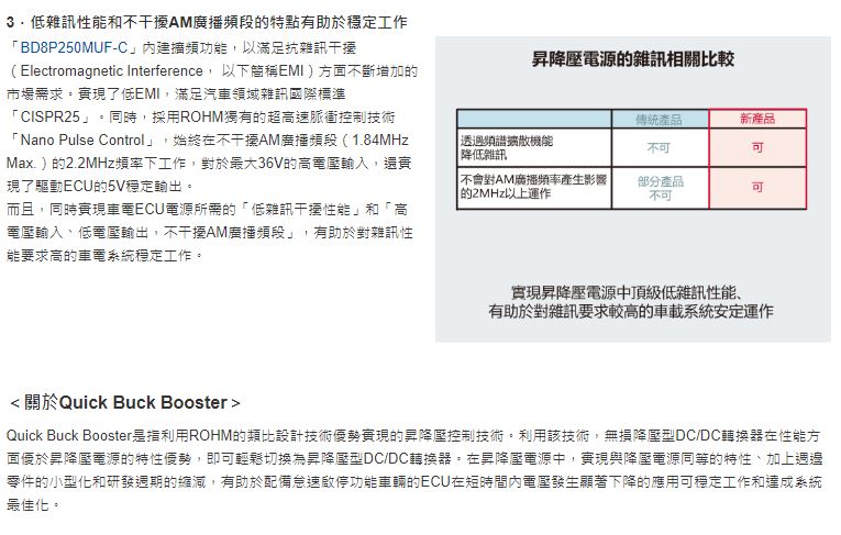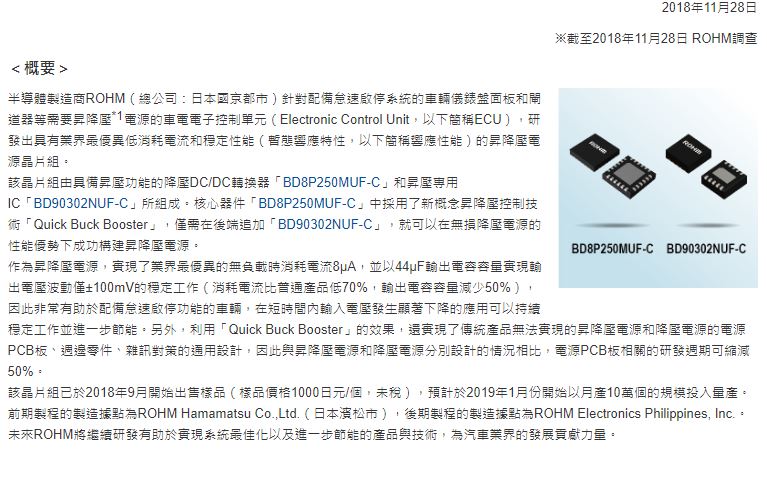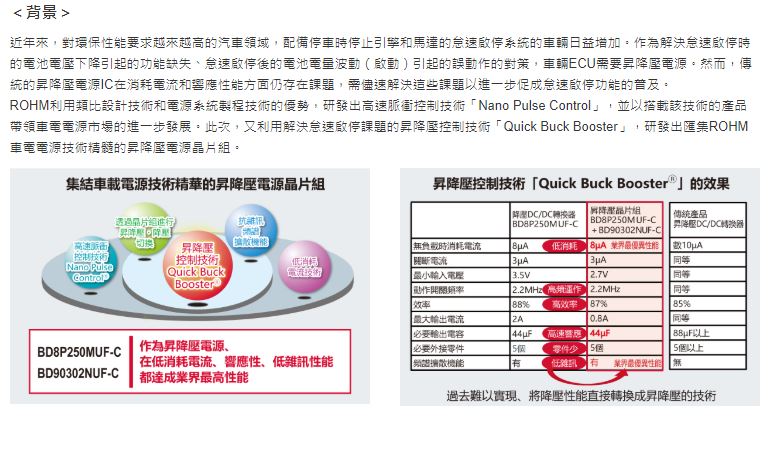- ROHM推出業界最優異※低消耗電流和高穩定性車電昇降壓電源晶片組 Quick Buck Booster先進技術有助於提昇配備怠速啟停功能車輛系統之穩定性
