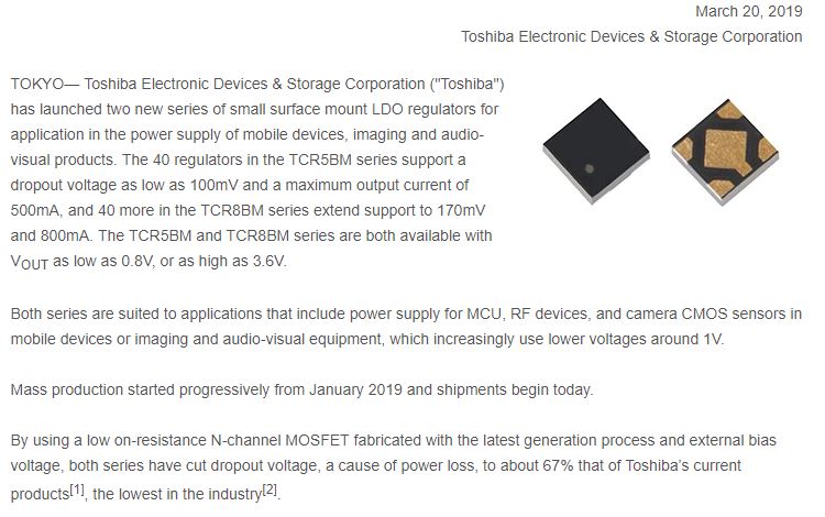 - Toshiba Launches Thin and Compact LDO Regulators that Help to Reduce Device Size and Stabilize Power Line Output